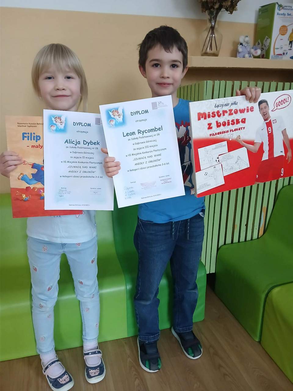 Gratulacje dla przedszkolaków: Emma Bacia, Róża Mazur, Marcelina Staroń, Szymon Fedeczko, Olaf Kobryn biorących udział w VI Miejskim Konkursie Plastycznym “CZUWAJĄ NAD WAMI ANIOŁY Z OBŁOKÓW” organizowany przez SP nr 26 z Oddziałami Przedszkolnymi w Dąbrowie Górniczej. Szczególne gratulacje dla Alicji Dybek za zajęcia II miejsca oraz dla Leona Rycombel za zajęcia III miejsca. BRAWA!!!