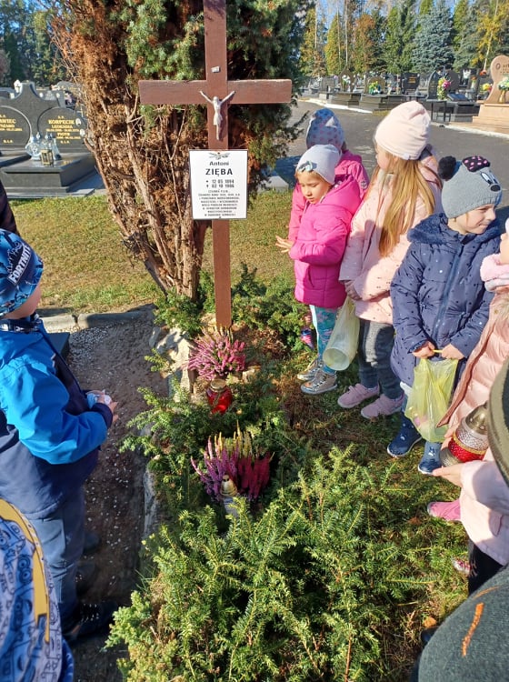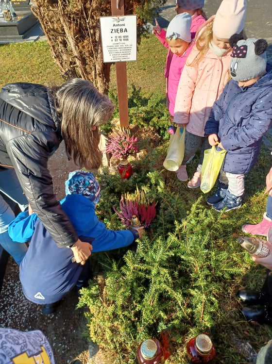 W ramach akcji „Szkoła pamięta” w dniu 28. 10. 2021r. przedszkolaki odwiedziły pobliski cmentarz, na którym zapaliły znicze na opuszczonych grobach. Znicz zapalony przez dzieci zapłonął również na mogile naszego lokalnego bohatera, którym był Antoni Zięba. Żołnierz roku 1920, 1939, A. K. i Powstania Warszawskiego. Nauczyciel i wychowawca wielu pokoleń młodzieży, były dyrektor Seminarium Nauczycielskiego w Dąbrowie Górniczej.