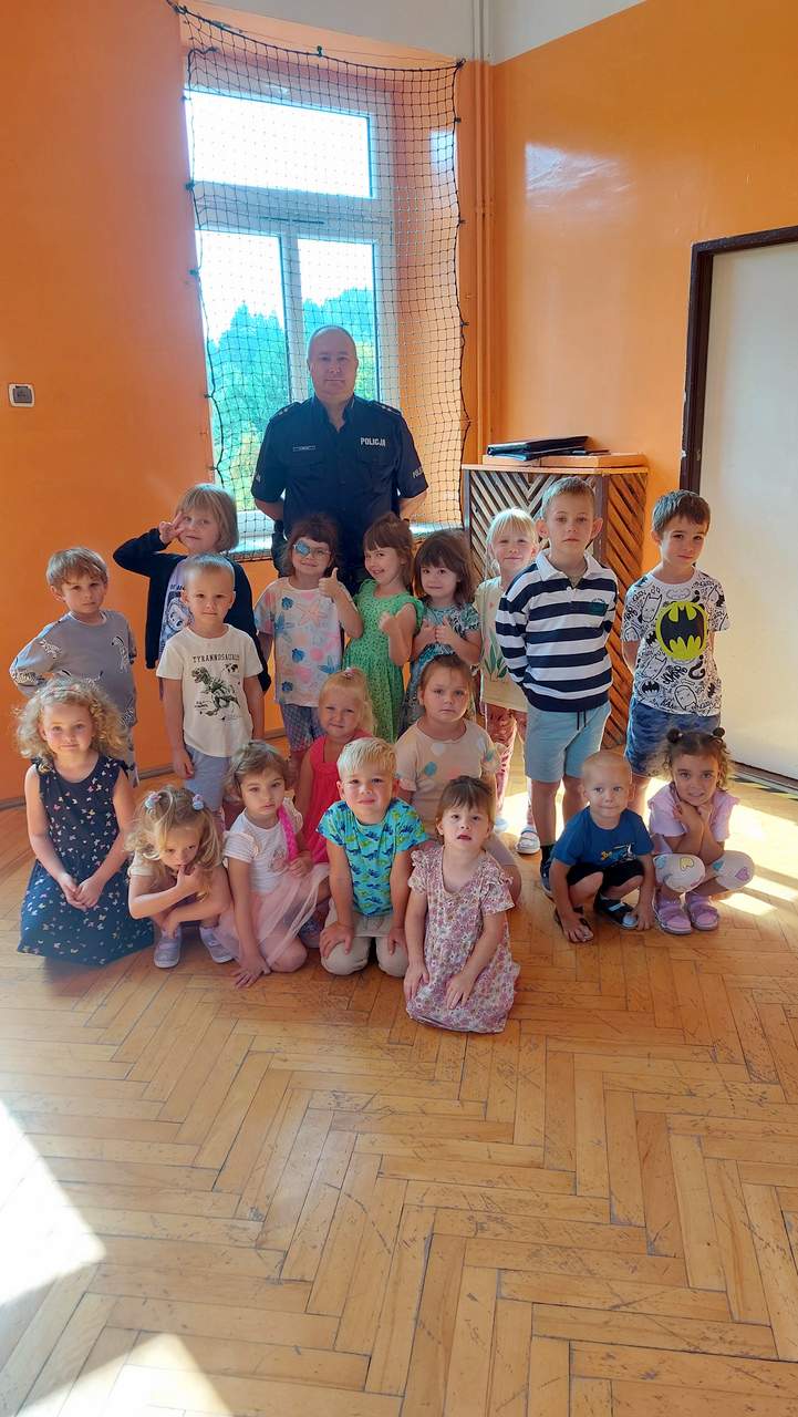 Wraz z rozpoczęciem nowego roku szkolnego przedszkolaki uczestniczyły w zajęciach z Panem Policjantem - dzielnicowym na temat bezpieczeństwa w ruchu drogowym. Poznały oraz przypomniały sobie numery alarmowe oraz zasady postępowania w kontaktach z nieznajomymi. Dzieci słuchały z wielkim zaciekawieniem oraz zainteresowaniem, a na koniec zadawały mnóstwo pytań do Policjanta.
