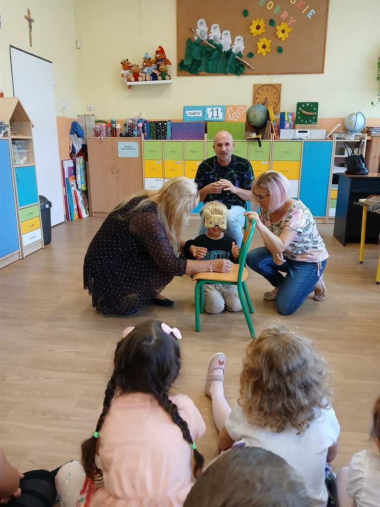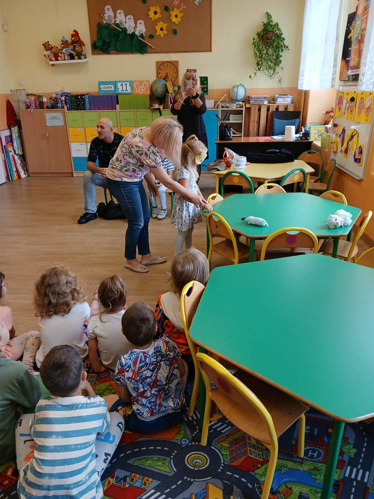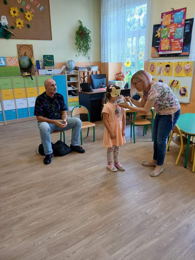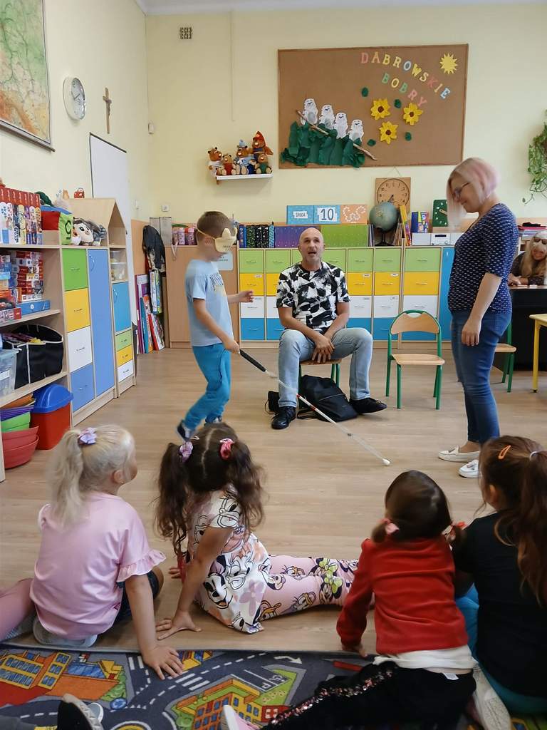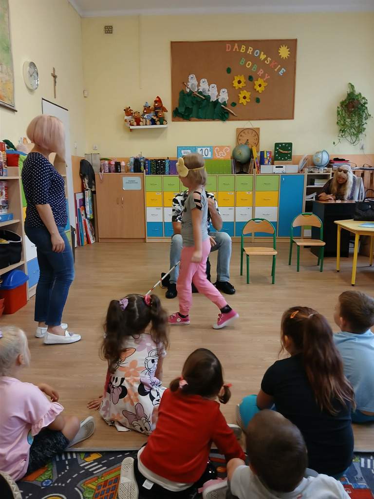 - 11.09.2025 - Justyna Margielewska, Karolina Żelichowska i Łukasz Baruch przygotowali dla najmłodszych kilka zagadek związanych ze światem osób niewidzących. Pierwszy „eksperyment” polegał na sprawdzeniu, jak wygląda ciemność, a potem dzieci próbowały odnaleźć się w roli przewodników, a nawet osób niewidomych, sprawdzając jak to jest używać białej laski do orientacji. Na fotografii, jedno z dzieci chodzi po sali z białą laską, ma zasłonięte oczy opaską – Kubuś Puchatek. Karolina Żelichowska pomaga w zadaniu, idąc za dziewczynką, obserwują ją inne dzieci. Tymczasem Łukasz Baruch tłumaczy przedszkolakom, dlaczego jest to trudne zadanie;