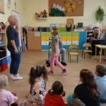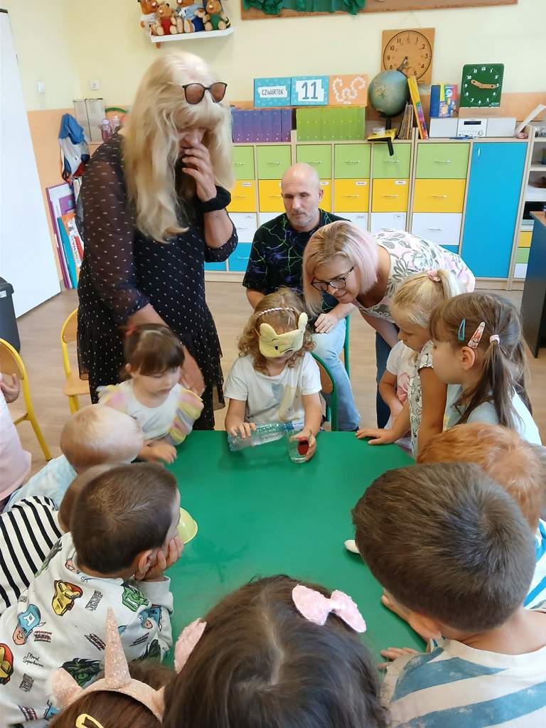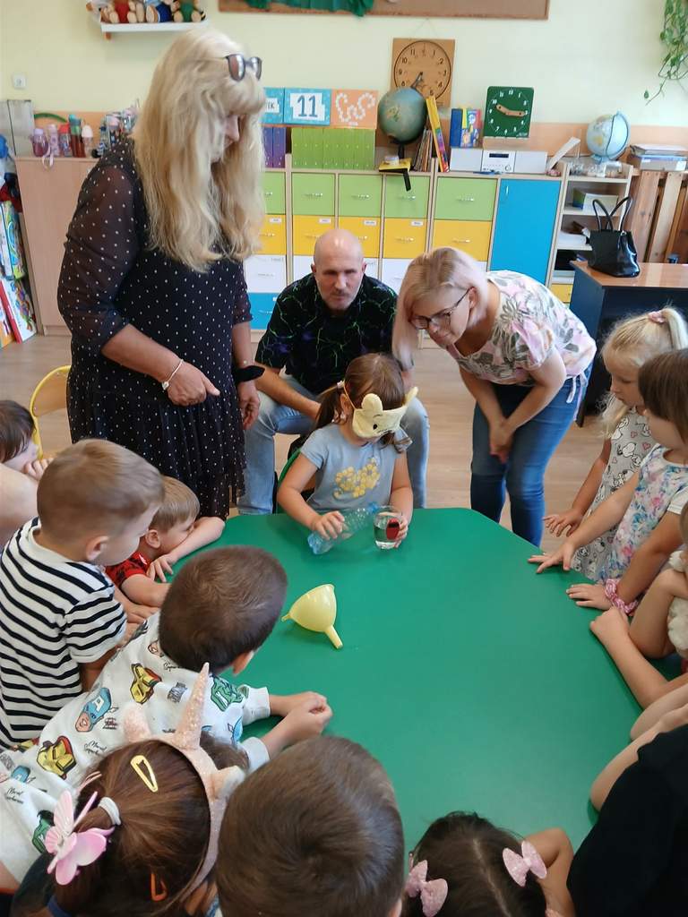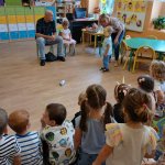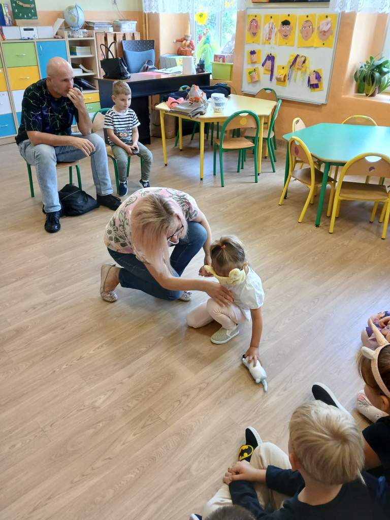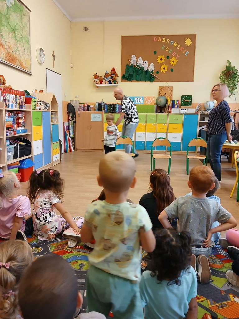 - 11.09.2025 - Justyna Margielewska, Karolina Żelichowska i Łukasz Baruch przygotowali dla najmłodszych kilka zagadek związanych ze światem osób niewidzących. Pierwszy „eksperyment” polegał na sprawdzeniu, jak wygląda ciemność, a potem dzieci próbowały odnaleźć się w roli przewodników, a nawet osób niewidomych, sprawdzając jak to jest używać białej laski do orientacji. Na fotografii, jedno z dzieci chodzi po sali z białą laską, ma zasłonięte oczy opaską – Kubuś Puchatek. Karolina Żelichowska pomaga w zadaniu, idąc za dziewczynką, obserwują ją inne dzieci. Tymczasem Łukasz Baruch tłumaczy przedszkolakom, dlaczego jest to trudne zadanie;