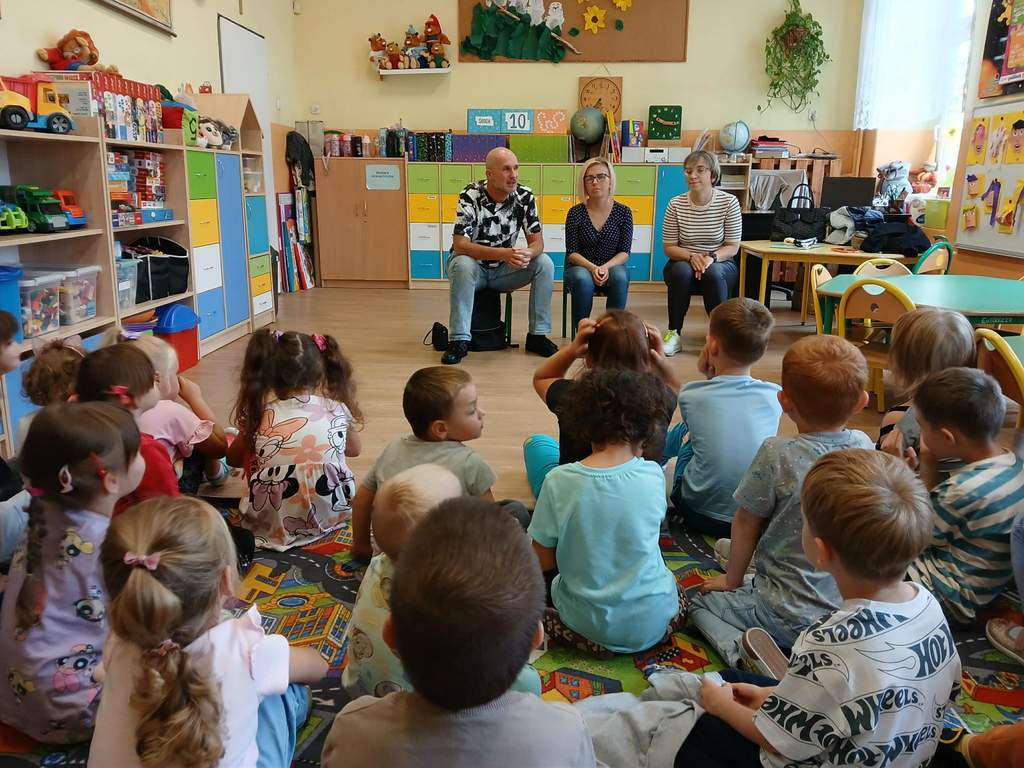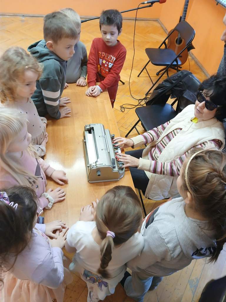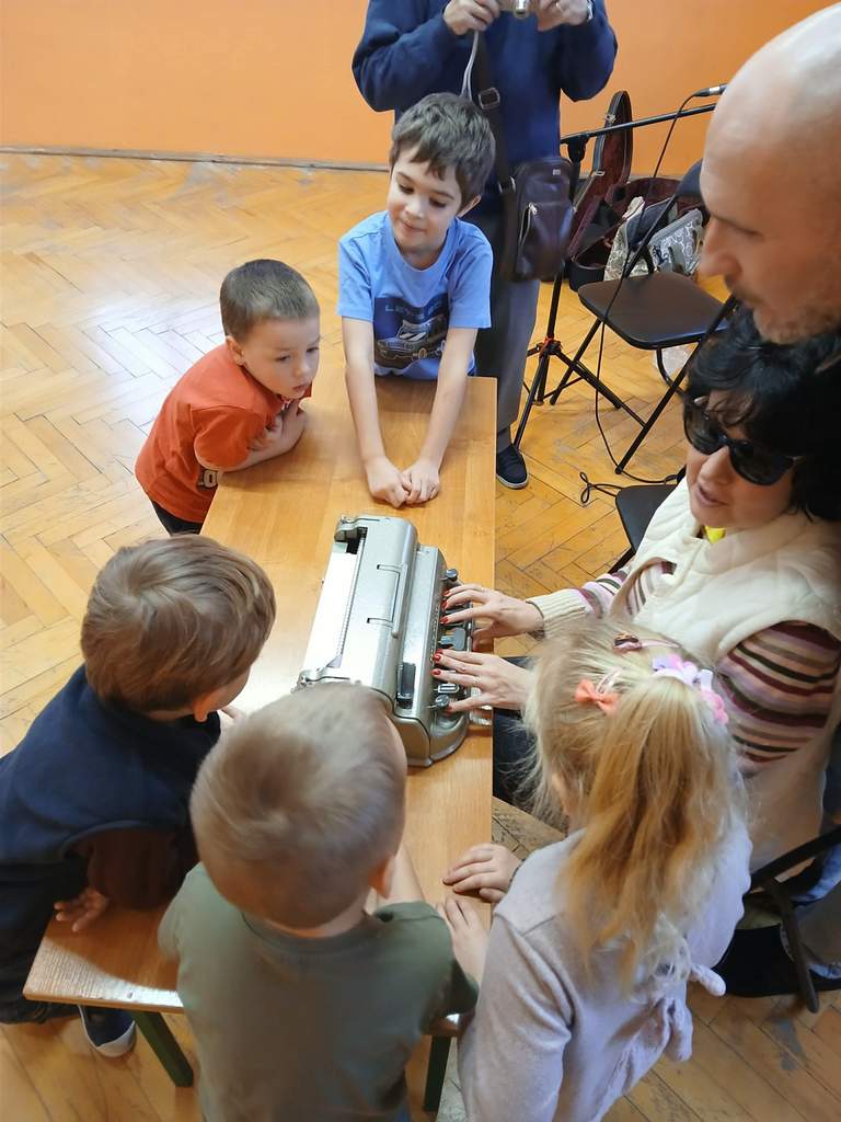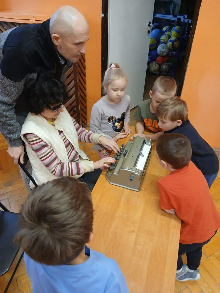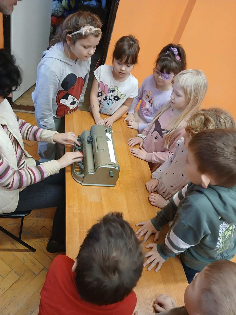 - 17.11.2025 - spotkanie z opowieścią muzyczną o tolerancji "Kwiatek Bratek". Na zajęciach, nie mogło zabraknąć muzyki (gry na gitarze), jak i wspólnych rozmów o ulubionych książkach. Jeśli mowa o czytaniu i pisaniu, pani Katarzyna Nowak z fundacji, wyjaśniała uczestnikom jak ona czyta, używając do tego celu zmysłu dotyku (pismo punktowe – alfabet Braille’a), a nie wzroku. Dzieci mogły z bliska przyjrzeć się temu urządzeniu.